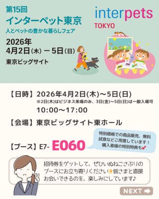 いぬねこさぷりの商品購入で当たる、東京ビッグサイトにて行われる日本最大級規模のペットイベント“インターペット”の招待券を8名様にプレゼントします♪